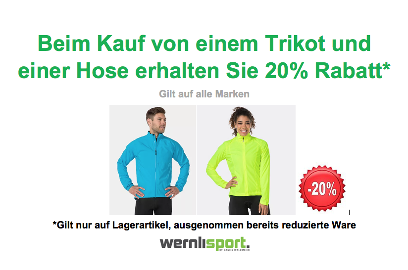 Beim Kauf von einem Trikot und einer Hose erhalten Sie 20% Rabatt